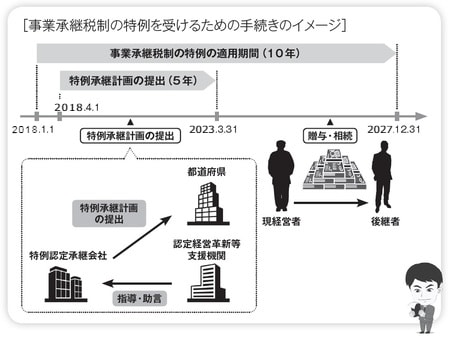 特例承継計画は、株式の承継を受ける予定の後継者(最大3名)等を記載して2023年3月31日までに提出します。その後、2027年12月31日までに贈与または相続等で社長から後継者に自社株を移すことにより、事業承継税制の特例の適用は可能になります。