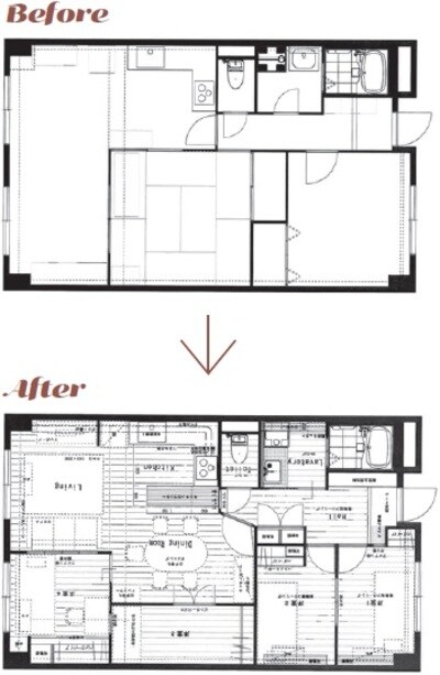 65平米の部屋に5人家族で住んでいたHさんも、同じ悩みを抱えていました。お兄ちゃんが2人いる末っ子の女の子は、中学生になるのに自室がなく、リビングで寝ているというのです。幸い、兄妹の仲が良く本人はまったく気にしていない様子でしたが、ご両親は「さすがにまずい」と考えてリノベを決意。「子ども部屋は3つ確保したい」というリクエストのもと、3LDKを4LDKに変更する図面をひきました。