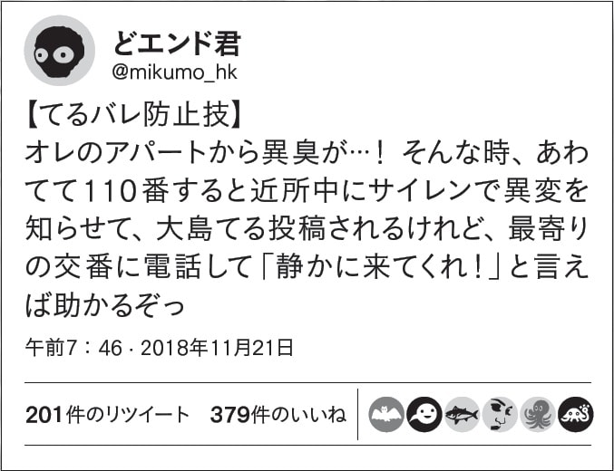 オレのアパートから異臭が…! そんな時、あわてて110番すると近所中にサイレンで異変を知らせて、大島てる投稿されるけれど、最寄りの交番に電話して「静かに来てくれ!」と言えば助かるぞっ