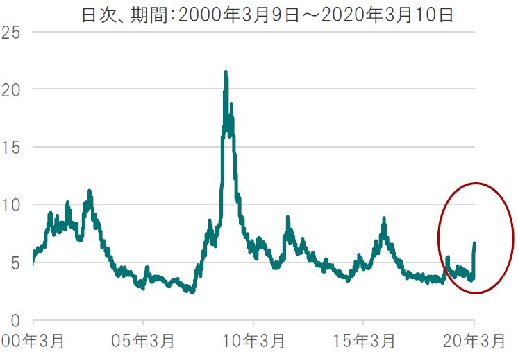 3月9日につけた米国公益株式と米国10年国債の利回り差異は2.63%と2013年5月2日の2.10%以来の高い水準で、過去平均からおよそ1.5標準偏差の水準をつけており、過去の水準からみても利回り差異が大きくなっています。インカムゲインの魅力が高まっており、バリュエーション(投資価値評価)的には、中長期的な投資機会を提供していると考えられます。尚、3月10日には株式市場は大幅に反発しているため、同利回り差異は2.34%となりました(図表3、4参照)。