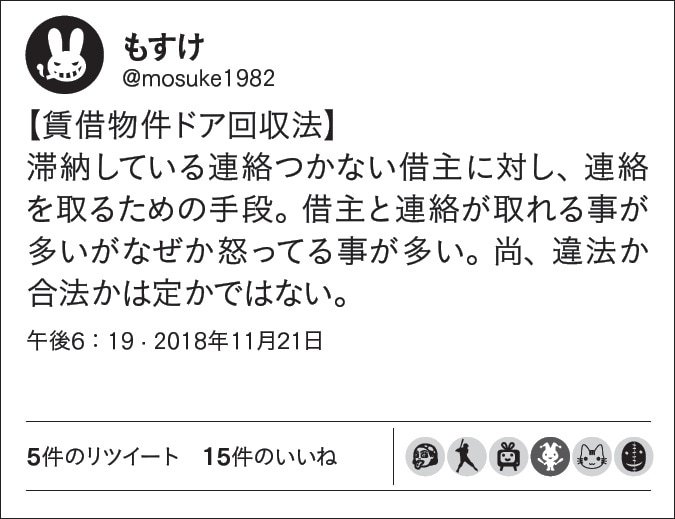 滞納している連絡つかない借主に対し、連絡を取るための手段。借主と連絡が取れる事が多いがなぜか怒ってる事が多い。尚、違法か合法かは定かではない。