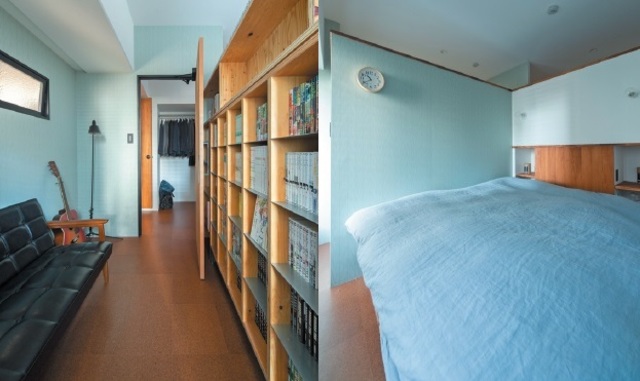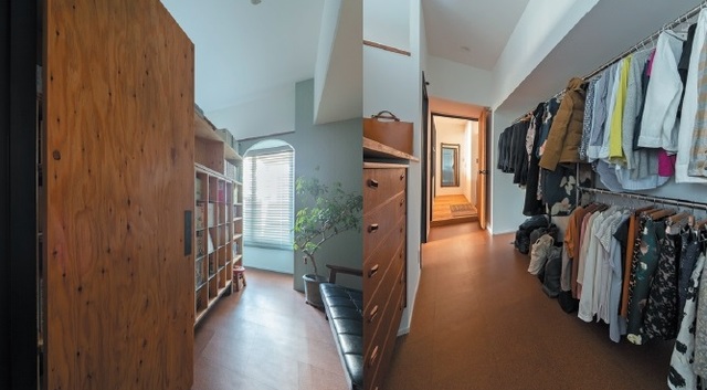 (左)ドアの木質感と床材のコルク、書庫へ陽を取り込む。(右)機能的な洋服収納二段式、通気性も確保。