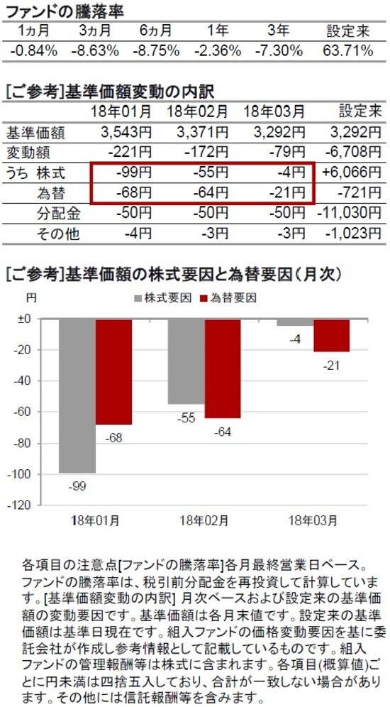 例えば、18年3月を見ると、1ヵ月で基準価額が79円の下落となっていますが、主な要因は為替と分配金だったことが分かります。また3ヵ月では騰落率-8.63%となっていますが、市況要因で申し上げると、株価と為替両方の要因でマイナスになっていることが分かります。