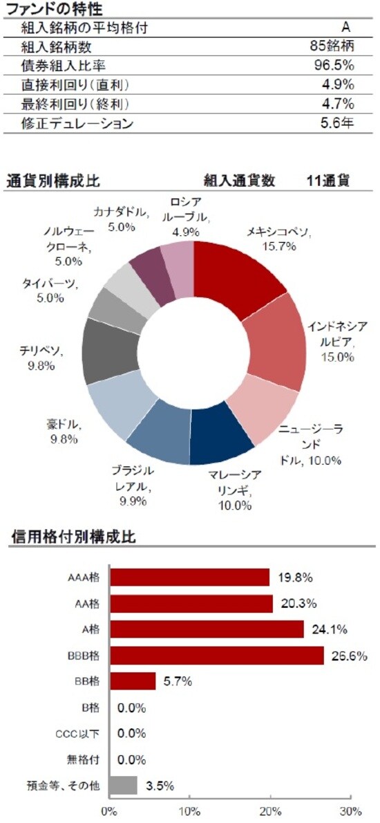 次に通貨別構成比によって、具体的な組入国と通貨を見ることができます。このファンドでは、11カ国、11の通貨に投資していますが、先進国はニュージーランド、オーストラリア、ノルウェーおよびカナダの4カ国、残りは新興国であることが分かります。