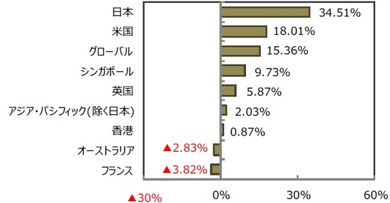 グローバル・リートは世界的な株価上昇や長期金利の低下を受けて15.36%上昇しました。