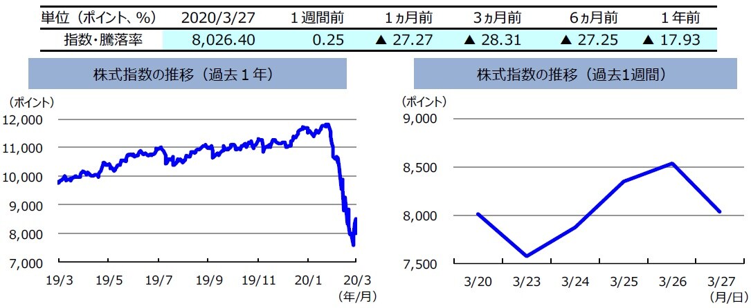 先週の豪州株式は、横ばいとなりました。新型コロナウイルスの感染が欧米を中心に急拡大し、グローバル景気の減速懸念がさらに強まりました。各国・地域はリーマン・ショック時を上回る早さで経済対策に動いています。各国株式市場は経済対策に対する期待と新型コロナウイルスに対する不安のはざまで推移しており、豪州株式市場も週間では不安定な推移となり、結果的にはほぼ横ばいとなりました。