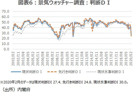 先行き判断DI(季節調整値)は前月差17.2ポイント低下の24.6になった。この水準はリーマンショック時の2008年12月の21.3、2009年1月の23.8に次ぎ3番目に悪い水準である。東日本大震災の時には現状判断DIは大幅に悪化したが、復興期待があるため先行き判断DIがそれほどは悪化しなかったと言える。今回の新型コロナウイルス感染は先行きが見えないため、先行き判断の悪化の程度が大きいようだ(図表6)。