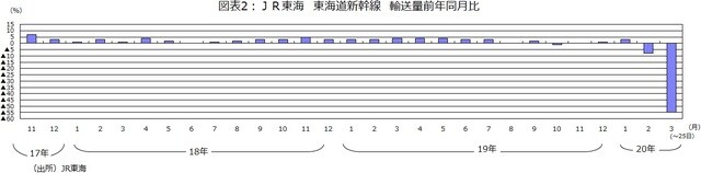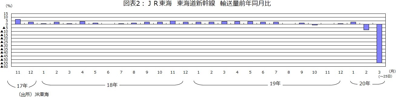 JR東海によると、1月の東海道新幹線の輸送量は前年比+3%の増加と堅調だったが、2月の東海道新幹線の輸送量・前年比は▲8%と減少に転じた。3月は25日までの輸送量・前年比が、新型コロナウイルスの感染拡大による国内旅行や出張の自粛で前年比▲55%と大幅な下落と、利用者が半減している(図表2)。
