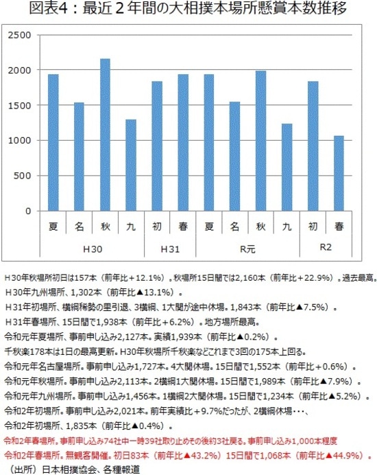大相撲春場所は無観客開催となった。懸賞はかけられたが、事前に申し込んだ74社中、一時39社が取り止めたという。その後数社が戻ったが15日間終わって、結局1,068本と前年同場所比▲44.9%の減少となった(図表4)。平成25年(2013年)九州場所の735本以来6年4ヵ月ぶりの低水準になってしまった。優勝した横綱・白鵬に掛かった懸賞が少ない日は1本ということもあった。横綱同士の相星決戦となった千秋楽結びの一番の懸賞は27本にとどまった。