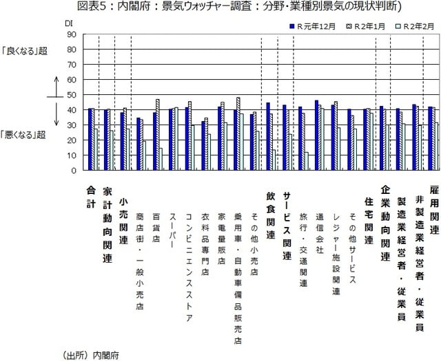 2月景気ウォッチャー調査、新型コロナウイルス感染拡大は百貨店、旅行・交通関連、飲食関連などに打撃