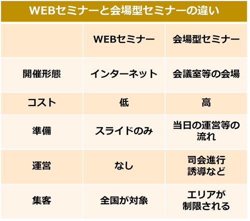 通常のセミナーは、会場を貸し切り、様々な施策で集客を行い、当日は来場者の誘導や司会進行等の運営を行いますが、「WEBセミナー」は、参加者側はPCやスマホで視聴ができ、主催側も来場者の対応をする必要がない、より利便性に富んだセミナー運営方法です。