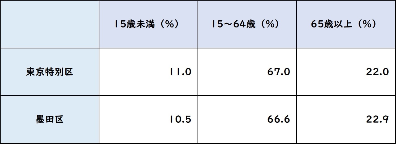 「押上」を不動産投資の観点でみていきましょう。 まず直近の国勢調査をみてみると(図表1)、「押上」のある墨田区の人口は25万人強で、人口増加率は東京都23区平均とほぼ同水準の3.5%。安定した人口増加をみせている地域です。人口構造(図表2)は、各世代、23区平均とほぼ同じである一方、単身者世帯比率(図表3)は、23区平均を1.5ポイントほど下回っています。単身者層に好まれる一方で、家族層にも好まれる住環境であることが起因すると考えられます。