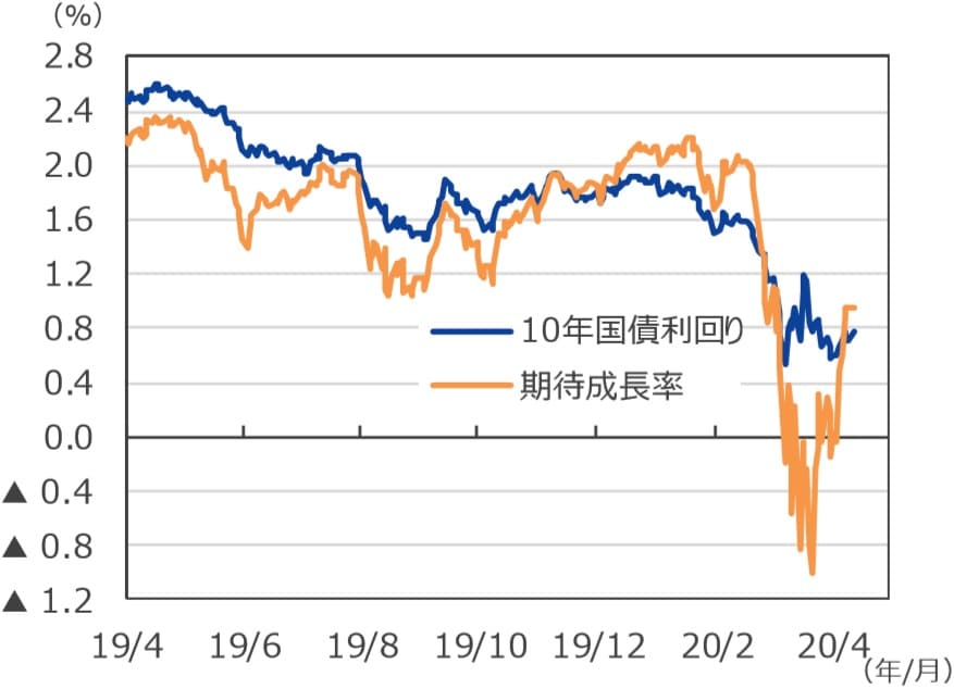 ■米国の一連の金融・財政政策が期待成長率の悪化に歯止めをかけたと言えますが、足元の業績悪化や新型コロナウイルスの見通しの難しさを念頭に置けば、短期間でこれまでと同様の成長期待に戻るのは難しいと思われます。