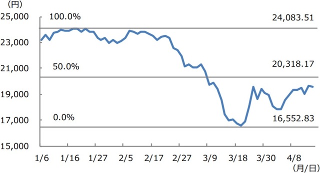 日経平均株価は、1月20日に24,083円51銭(終値ベース、以下同じ)の高値をつけていましたが、その後は新型コロナウイルスの世界的な感染拡大を受けて急落し、3月19日には16,552円83銭の安値をつけました。しかしながら、4月15日には19,550円09銭まで値を戻し、1ヵ月足らずで3,000円ほど水準を切り上げました。4月9日から15日までは、取引時間中も19,000円台を維持しており、比較的落ち着いた様子がうかがえます。