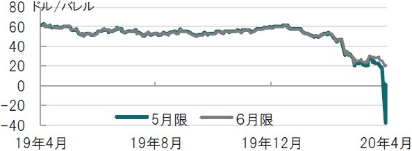 米ニューヨークマーカンタイル(商業)取引所(NYMEX)の原油先物市場で、2020年4月20日に、原油価格の指標となる米国産ウェスト・テキサス・インターミディエート(WTI)原油の先物価格(20年5月物)が1バレル=マイナス37.63ドルで取引を終えました(図表1参照)。これは原油先物の取引が1983年に始まって以来、最低の水準となります。