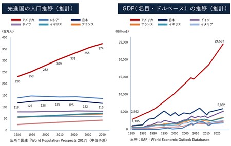 日本もGDPはプラス成長をしていますが、2018年度のGDP成長率(速報値)は前年比プラス0.7%にとどまり、2017年度のプラス1.9%を下回りました*。また、ドルベースで見たGDPの推移は、日本やドイツなどの主要先進国が伸び悩む中、アメリカは成長を続けています。
