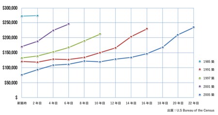 一方、アメリカの中古住宅市場は、築年数にかかわらず価格が上昇傾向にあり、築年数が経過しても価格が上昇しています。そのため、アメリカ不動産投資では、賃貸収入によるインカムゲインだけでなく、保有している不動産の売却時にはキャピタルゲインを得やすい環境であるといえます。