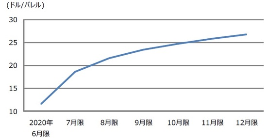 そのため、先物取引の中心が、すでに次の6月限月に移行し、5月限月の流動性が相対的に低下するなかで価格が大きく振れ、マイナスをつけてしまった可能性はあります。WTI原油先物の限月は毎月設定されているため、6限月から12月限月までの先物価格で形成される「先物曲線」を確認してみます(図表1)。これをみると、いずれもプラスの価格となっており、マイナス価格は一時的な現象であることを示唆しています。