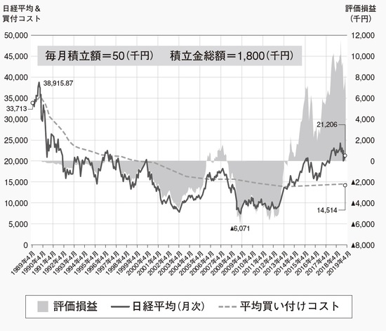 スタート時点の1989年4月末の日経平均株価が3万3713円に対して、ゴール地点の日経平均株価が2万1205円と、日経平均株価が1万2508円、率にして37%も下落したにもかかわらず、「ドルコスト平均法」の効果によって平均買付コストが1万4614円に抑えられたことで、株価が大きく値下がりする中でも800万円を超える評価益を確保するという好結果になりました。