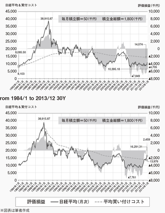では次に、僅かな投資期間の違いで結果が大きく変わってくることを確認してみましょう。ここでは、1983年1月から2012年12月の30年間と、前述の1989年4月から2014年3月までの30年間で同じ「ドルコスト平均法」で日経平均株価に投資した場合の結果を比較してみたいと思います[図表2]。
