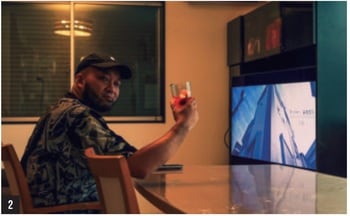 [2]60インチの大画面を前にリビングで晩酌。ここに自分で作ったモツ煮込みが加われば、もはや敵なしだ。