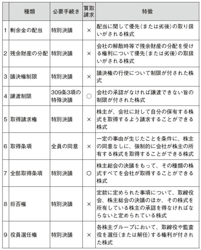 種類株式には、いくつかのタイプがあります。まとめてみると下記図表のようになります。すべてが事業承継に使われるわけではありませんので、一般的に利用されるものを紹介しましょう。