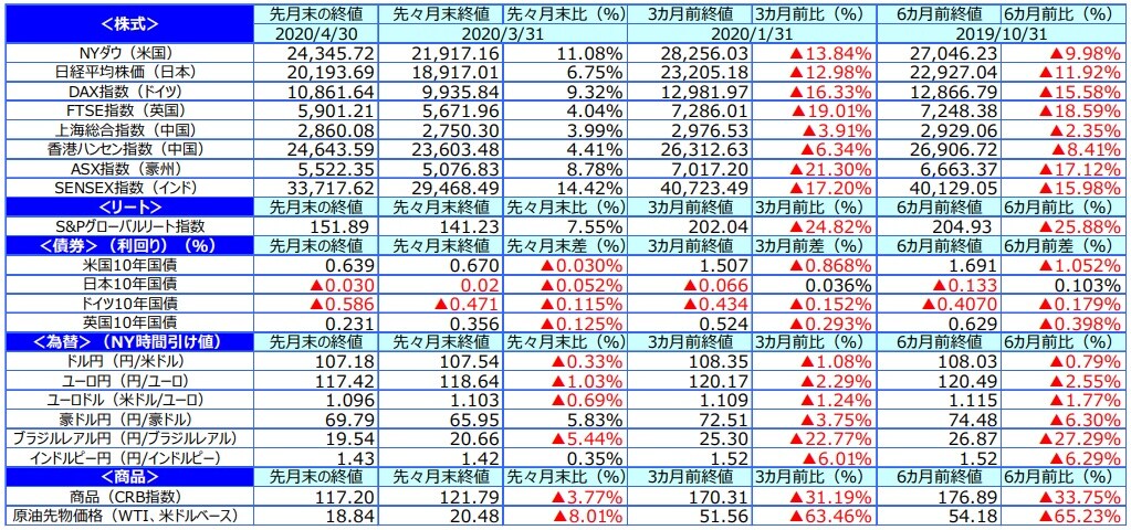 世界の株式市場は新型コロナ感染拡⼤による急落から反発しました。⽉後半、原油先物価格の急落を受けて株式市場も下落する場⾯もありましたが、⽶欧での感染拡⼤がピークを越えたとの⾒⽅から経済再開への動きや期待感が広がったことや、各国の積極的な財政⾦融政策を好感し株式市場は上昇しました。⽶国の株式市場では、トランプ⼤統領が経済再開の指針を発表したことや、新型コロナ治療薬への期待などを背景にNYダウ⼯業株30種平均が10%を超える上昇となりました。欧州の株式市場も、イタリアやスペイン、フランスなどで感染拡⼤が落ち着き、各国でロックダウン解除に向けた報道が相次いだことから総じて上昇しました。⽇本の株式市場は、海外市場の上昇に⽀えられましたが、国内での感染拡⼤がまだ続いていることなどから⽶欧に⽐べ⼩幅な上昇となりました。