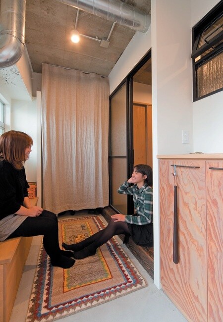 玄関を広げ、土間には室内温度とカビ防止でウェルカムスペースを。