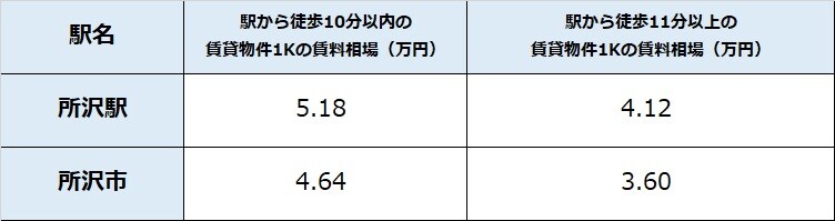そんな「所沢」駅周辺の家賃水準をみていきましょう。駅から徒歩10分圏内の1Kの平均家賃は5.03万円、11分を超えると4.73万円となっています(図表1)。所沢市全体の家賃水準は、駅10分圏内が4.03万円、11分を超えると3.58万円。「所沢」駅周辺は街の中心部にふさわしい家賃水準だといえるでしょう。