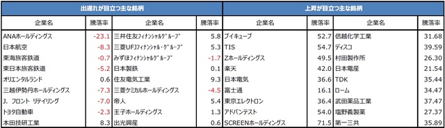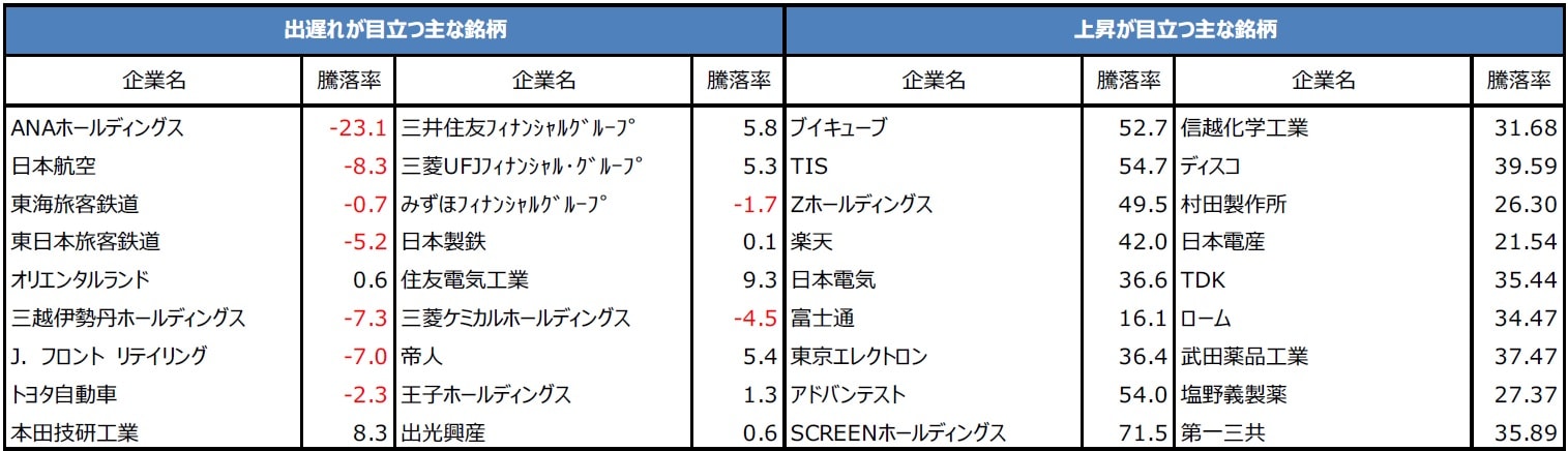 ●ANA、JR東海、三越伊勢丹など接触や対面の機会が多い企業の株価は低調な動きがみられる。