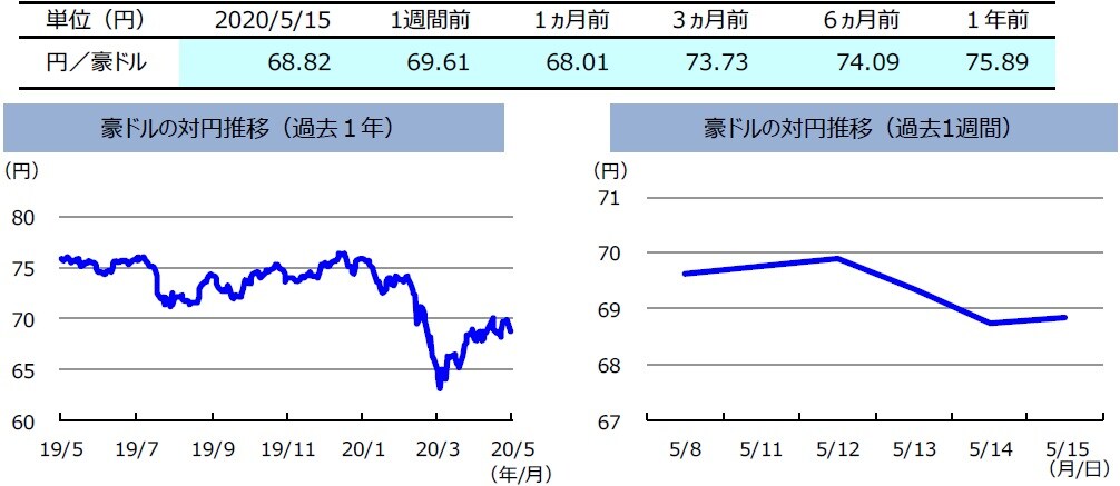 先週の豪ドルの対円レートは、下落しました。世界の金融市場では経済活動再開に対する期待が残る一方、行動制限緩和による感染再拡大に対する懸念が強まっています。先週は、パウエル米連邦準備制度理事会(FRB)議長が「経済の長期的な停滞リスク」を表明したことや、米中関係の悪化が懸念されたことから、リスク回避の動きが強まったことに加え、食肉輸出に関する豪中関係の悪化が懸念されました。豪ドルは主要国通貨に対して売られ、豪ドルの対円レートも下落となりました