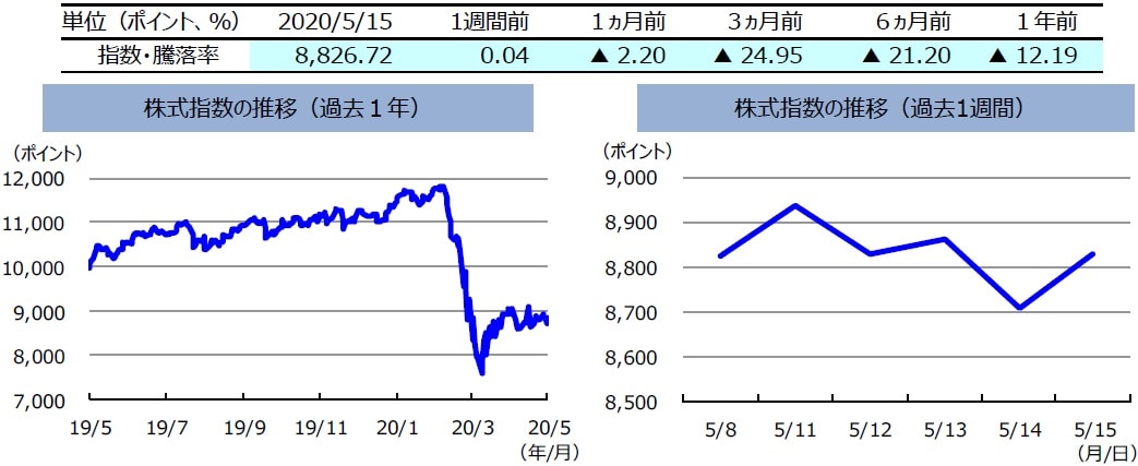 (注)左グラフは2019年5月15日~2020年5月15日、右グラフは2020年5月8日~2020年5月15日。
