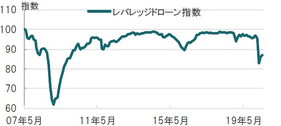 レバレッジドローン市場の動向を金融危機前後から足元まで振り返ると、レバレッジドローン市場は足元2割程度下落しましたが、当局のてこ入れで落ち着きを取り戻しています(図表1参照)。08年のリーマンショックが「金融危機」の性格であったのに対し、今回は新型コロナウイルスの世界的な感染拡大と、移動制限による景気の深刻な落ち込みで性格は異なります。また、金融危機後の規制がある程度ショックを吸収している可能性はあります。これらを背景に、金融危機時ほどの落ち込みには、今のところ至っていないという面は見られます。金融安定報告書でもレバレッジドローンを利用する企業の債務不履行(デフォルト)率は、金融危機当時の10%程度を下回っていると指摘しています。