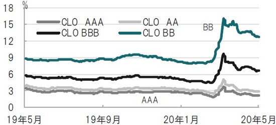 最近の利回りを見ると、AAAなど高格付けのCLO利回りはコロナショック以前の水準を下回るまで改善が見られます。当局による証券化商品の救済策(TALF)などが機能した面はあると思われます。一方、格付けの低いCLO利回りは、FRBと財政政策による救済策でもカバーが不十分なこともあり、コロナ前の水準を回復できていません。
