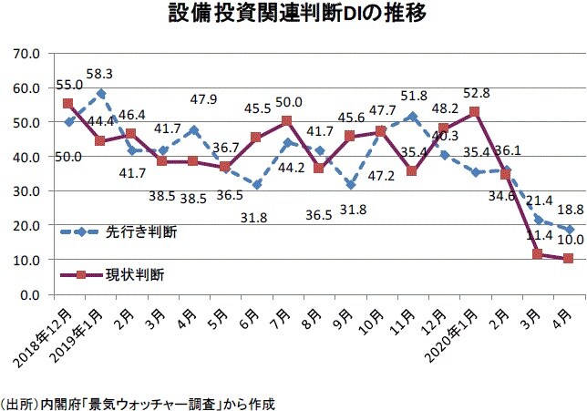 ●景気ウォッチャー調査の設備投資関連・DIの最近の動きをみよう。20年1月の現状判断DIが52.8(同9人)と18年12月分の55.0以来の50超となった。グラフからは設備投資関連・現状判断DIの底堅さが感じ取れるようになってきていた。しかし、新型コロナウイルスの影響で現状判断DIは2月34.6(同13人)、3月11.4(同11人)、4月10.0(同5人)へと急落した。4月には「新型コロナウイルスの影響で客の設備更改、新規の設備投資や購入などが控えられ、受注件数や受注量も例年例月の3割程度にとどまっている。また、営業も感染への影響から訪問営業活動を社会機能維持の客に限定するなど控えるよう指示しており、来月以降の受注実績が例月の1割程度と伸びていない」(中国、通信業〔営業担当〕)といった厳しいコメントがみられた。