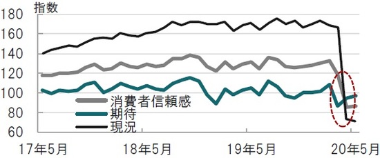 次に、地理的には離れますが、米コンファレンスボードの消費者信頼感指数をみると、消費者マインドは現況指数は軟調ながら期待指数は改善と、企業マインドと同様の傾向が見られました。米国でも州の状況に応じて移動制限など経済活動の制約が緩和される方向の中、消費者のマインド先行きに希望を持ち始めていることがうかがえます。