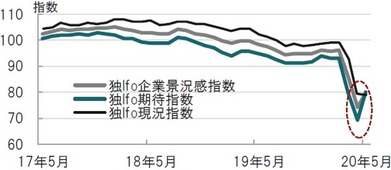ドイツIfo経済研究所が2020年5月25日に発表した5月の企業景況感指数は79.5と、市場予想(78.5)、前月(74.2)を上回りました。特に、半年先を予想しての回答である期待指数は80.1と、市場予想(75.0)を大幅に上回りました(図表1参照)。ドイツ企業は慎重ながらも7-12月(下期)の景気改善を期待していることがうかがえます。