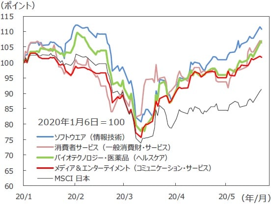 ■世界的に都市閉鎖の動きが緩和され、経済活動の再開に対する期待が株価を支える構図が続きそうです。市場のけん引役もウィズコロナが中心となり、市場の2極化が続く可能性が高いと考えられます。ただ、今後求められるのは、ウィズコロナ下での新たな付加価値の創造であり、出遅れたセクター・企業の巻き返しが注目されます。