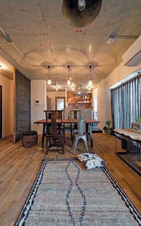 アートギャッベとLDK、キッチンの正面はブロックを施す。