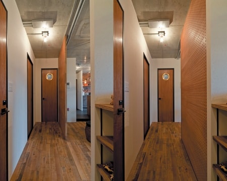 (左)モノレール式の大型開閉壁、反対側は黒板塗装で。(右)そもそも廊下をリビングに取り込む。