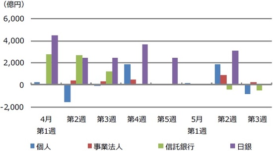 ●海外投資家は4月中旬以降売り越し基調だったが日本株の堅調推移で5月第3週は買い越しに。