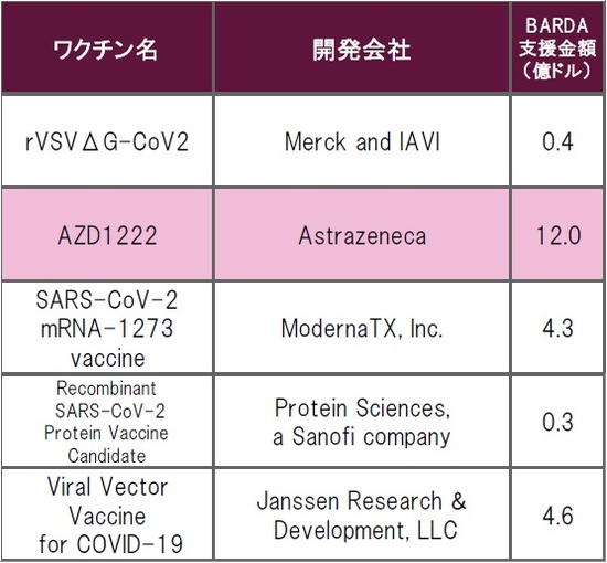 BARDAは5月21日、英医薬品大手アストラゼネカと新型コロナウイルスのワクチン開発で提携することを発表、BARDAは12億ドルの支援を行い、アストラゼネカは少なくとも3億回分のワクチン供給を目指す。早ければ今年10月に最初のワクチン供給を行う予定だ。HHSは今回の提携を「ワープ・スピード作戦」のマイルストーンと位置づけている。