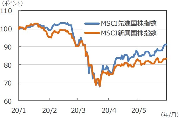 ■新型コロナウイルスの感染拡大の影響で世界の株式市場は2月から3月にかけて急落しましたが、各国の大規模な財政政策や過去に例のない積極的な金融緩和を好感し、底入れしました。ただ、底入れ後の反発力は、先進国と新興国の株式市場で大きな差が生じています。新型コロナ対策で実施された行動制限により、先進国では新規感染者数がピークアウトし、景気回復への期待が高まった一方、多くの新興国では感染拡大に歯止めがかからないことが影響していると考えられます。