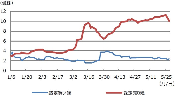 ただ、ネット裁定残高のマイナス幅は、5月25日以降、徐々に縮小し、5月28日時点で約7億6,200万株となっています。また、日経平均株価は昨日、22,000円台を回復して取引を終え、本日午前の取引でも、22,000円台前半で底堅く推移しています。これは、海外投資家による先物の買い戻しを機に、裁定売り取引の解消(先物売り、現物買い)などが進み、現物が上昇して、ネット裁定残高のマイナス幅が縮小したものと推測されます。