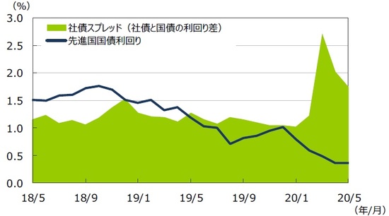 主要先進国の国債利回りは、欧米を中心とした経済再開の動きを背景にやや上昇しました。新型コロナ感染拡大を受けて各国中央銀行が強力な資金供給を実施したことなどから、利回りの上昇は抑制されたものとなっています。一方、国債と社債の利回り格差は縮小しました。米連邦準備制度理事会(FRB)の社債ETFの購入開始などが背景です。
