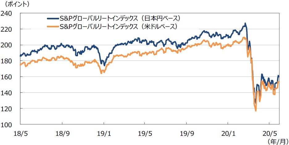 グローバルリート市場(米ドルベース)は、欧米など主要先進国で経済再開の動きが始まったことは好感されたものの、引き続き新型コロナの経済への影響が懸念されたことが重石となり、前月末比0.71%の上昇となりました。また、円ベースの月間変化率では、経済再開の動きやワクチン開発への期待などを背景とした米国株式市場の上昇などから米ドルが円に対し上昇し、同1.47%の上昇となりました。