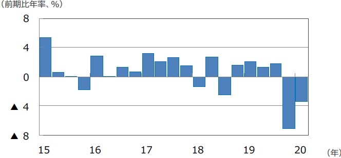 日本の20年1-3月期の実質GDP成長率は、前期比年率▲3.4%となり、外出自粛によるサービス消費減少と外需の落ち込みが顕著となりました。