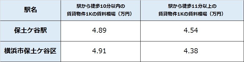 「保土ケ谷」駅周辺の家賃水準をみていきましょう。まずは駅周辺の家賃相場です。駅から徒歩10分圏内の1Kの平均家賃は4.89万円、11分を超えると4.54万円(図表1)。同条件の横浜市保土ケ谷区の家賃水準は、駅10分圏内で4.91万円、11分を超えると4.38万円。「保土ケ谷」駅周辺は、保土ケ谷区の平均と同じ家賃水準です。