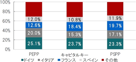 なお、PEPPのキャピタルキーの制約は一部柔軟で、特定の国の国債を購入して後から帳尻を合わせる運用も可能と見られていましたが、ここまでの購入実績(図表1左の棒グラフ)を見ると、ほぼキャピタルキーの割合通りの運用です。