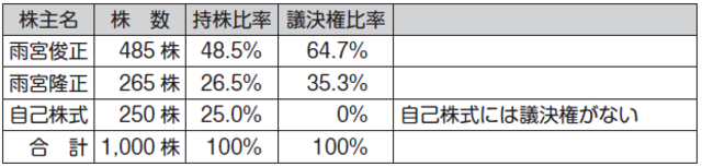 上記のように、後継者である雨宮俊正の議決権比率が64.7%となり、会社を日常的に支配できる3分の2を割りこんでしまうため、事業承継の後に何かと隆正に配慮して経営判断を下さなくてはならなくなる可能性が出てきました。